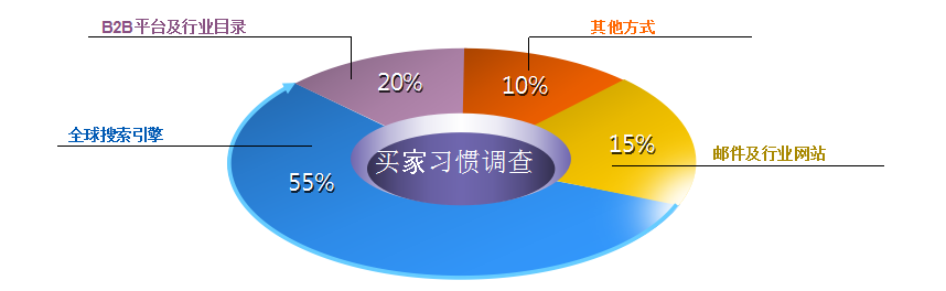 加拿大“Enquiro Search Solutiosn”,曾做过B2B电子商务研究报告报告,报告显示,买家在通过互联网查找供应商时会把约55%左右的精力放在GOOGLE等通用搜索引擎上,约20%左右的精力放在B2B平台上,约15%左右的精力放在邮件及行业网站上,还有约10%左右的精力放在其他途径上。