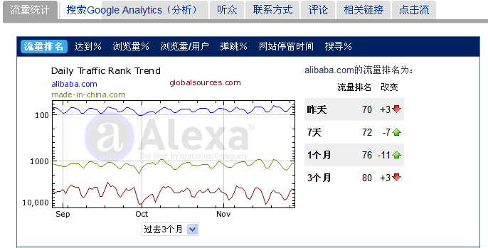网站流量对比,阿里巴巴的流量最高,环球资源的流量最低,当然这与环球资源不仅仅通过网络推广有关(图为历史数据)