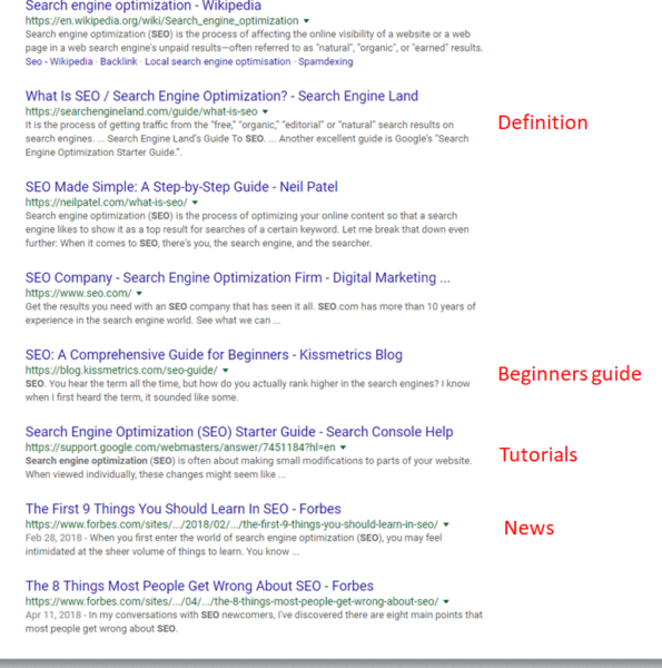这里的一个关键点是理解给定关键字搜索背后的意图。用户想要查找特定信息,而搜索引擎具有高级算法和大量的分析流量,以确定哪些结果最适合关键字。