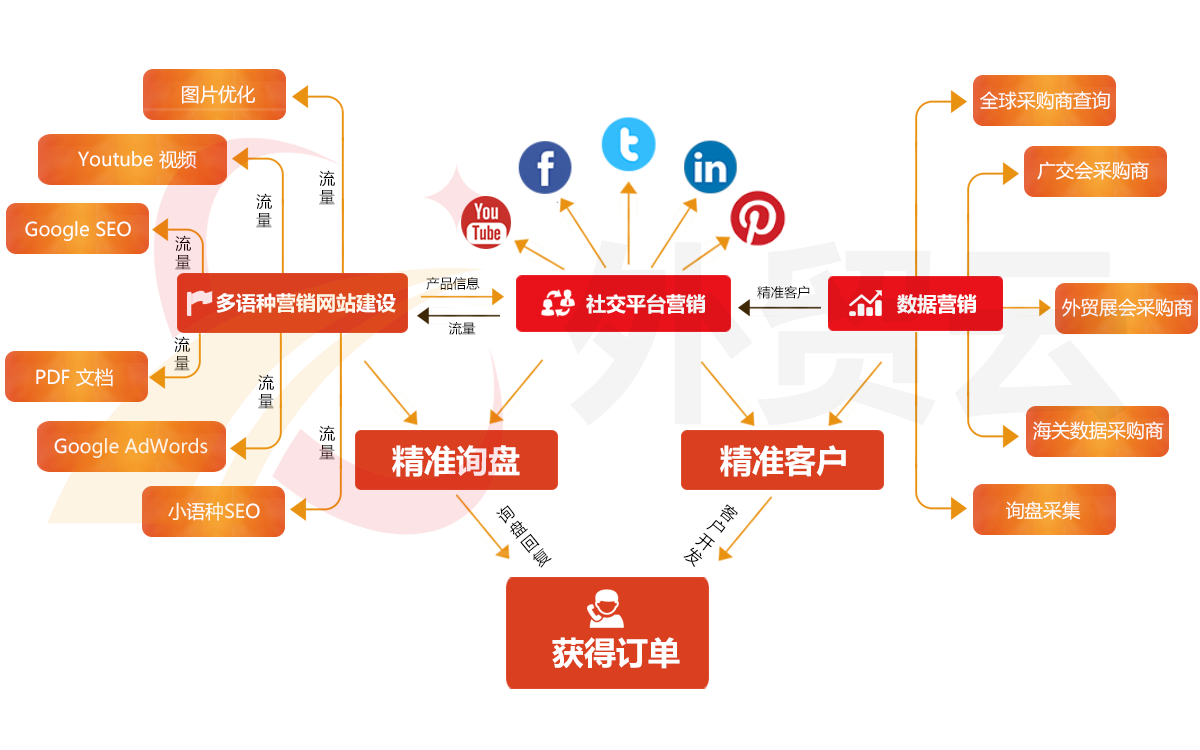 外贸云是以领先的搜索引擎优化技术、智能响应式建站技术、104种语言翻译技术、多渠道营销推广技术,买家大数据挖掘技术,帮助外贸企业通过多语言、多关键词、多搜索引擎、多渠道推广的模式整合,为企业提供多元、高效、高转化的外贸整合营销一站式解决方案。