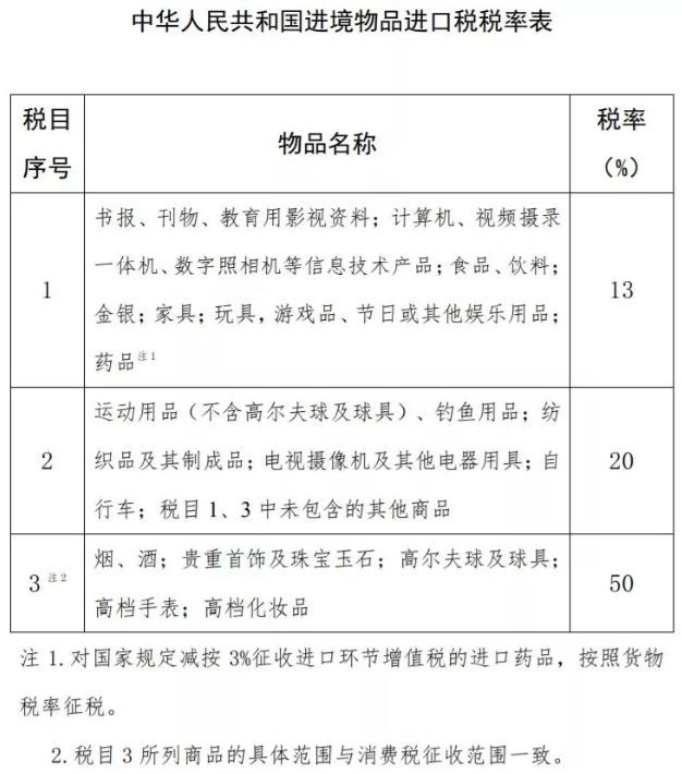 根据调整,税目1、2的税率将分别由现行15%、25%调降为13%、20%。调整后,行邮税税率分别为13%、20%、50%。适用于13%一档的物品包括书报、食品、金银、家具、玩具和药品。适用于20%一档的物品包括运动用品(不含高尔夫球及球具)、钓鱼用品、纺织品及其制成品。适用于50%一档的物品包括烟、酒、贵重首饰及珠宝玉石、高档手表、高档化妆品。