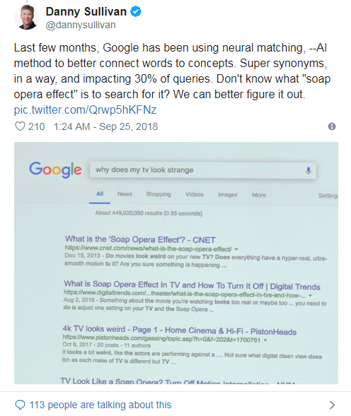 Google搜索Liason Danny Sullivan第一次谈到这个问题是在九月份的20周年纪念日发布的。沙利文说,“搜索的巨大变化”是理解同义词的能力。“人们搜索的方式通常与人们编写解决方案的信息不同。”
