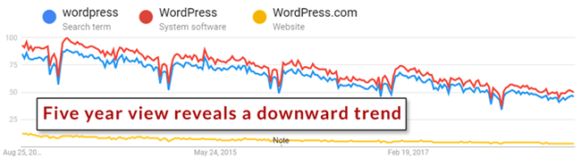 例如,回顾一下五年来关于搜索词WordPress(建站平台)、WordPress软件和WordPress.com网址的趋势: