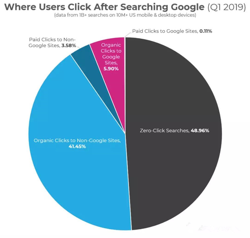 同时我们也要注意,2016-2019这3年间,谷歌用户的点击流量下降了20%,这是一个非常可怕的数字,对SEO最大的影响就是明明本来可以点击到我们的网站详细了解,但是现在只需要在搜索页面最上面就看到了答案。