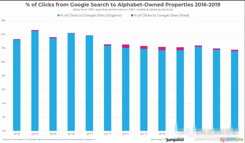 下面这个图是2016-2019,有多少比例的点击到谷歌自己家的产品网站,看出来基本上没有什么变化,大部分都是非谷歌旗下的网站。