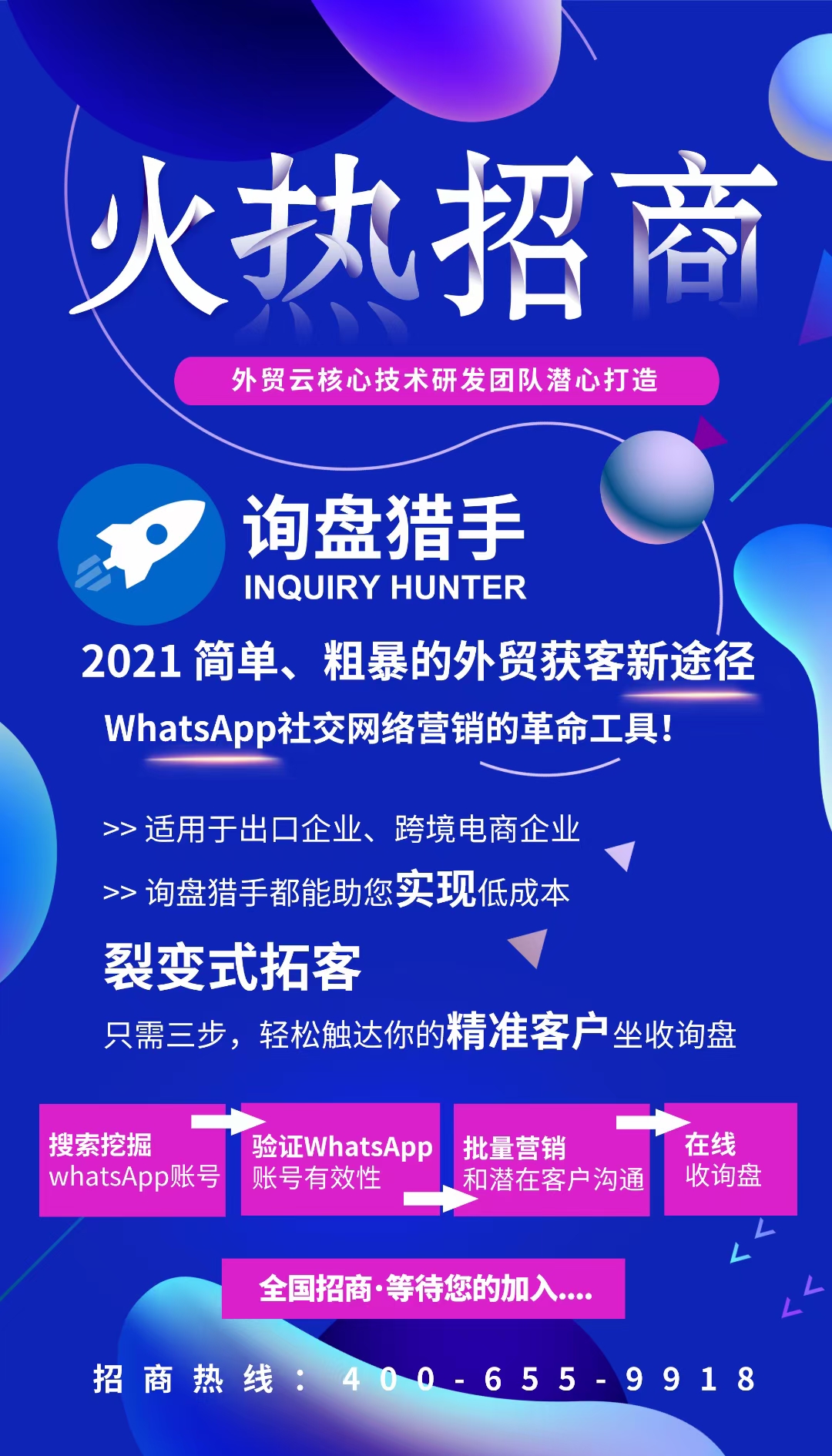 询盘猎手是从海外社媒、搜索引擎、互联网大数据挖掘精准潜在客户的WhatsApp账号,经验证有效性后,批量营销和潜在客户沟通,在线收询盘的外贸大数据获客系统。