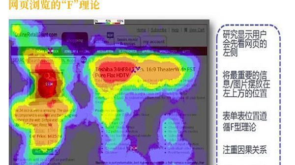 页面结构要符合用户浏览习惯,用户的浏览习惯一般由上到下,由左到右,遵循F型线路,把最吸引目标客户和最有销售力的产品放在最佳位置。
