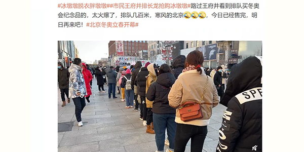 线下,北京众多冬奥会旗舰店客流不断激增、线下实体店更是排队长达几百米。