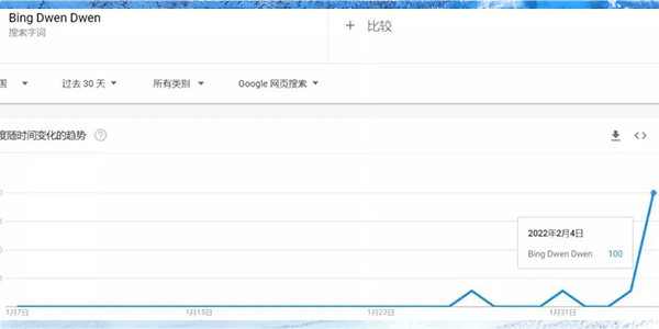 据谷歌趋势显示,包含BingDwenDwen的关键词搜索量自今年2月3号起就迅速暴增,仅仅一天时间就达到了峰值100。