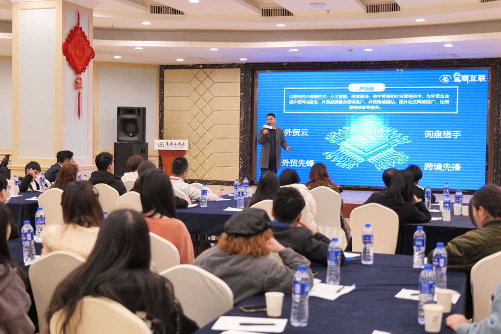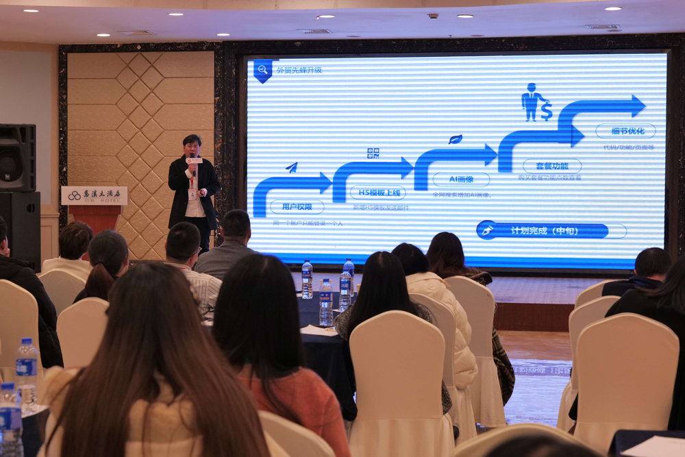 接着就是来自易商互联技术总监杨星围绕2022年“拼搏、奔跑、征程”主题,将大会推向高潮!杨总在会议上提出了深入外贸智能化管理、满足多元化的外贸市场需求,对外贸云进行了新功能升级,外贸先蜂用户权限、H5模板、AI画像、功能升级、细节优化等产品升级。