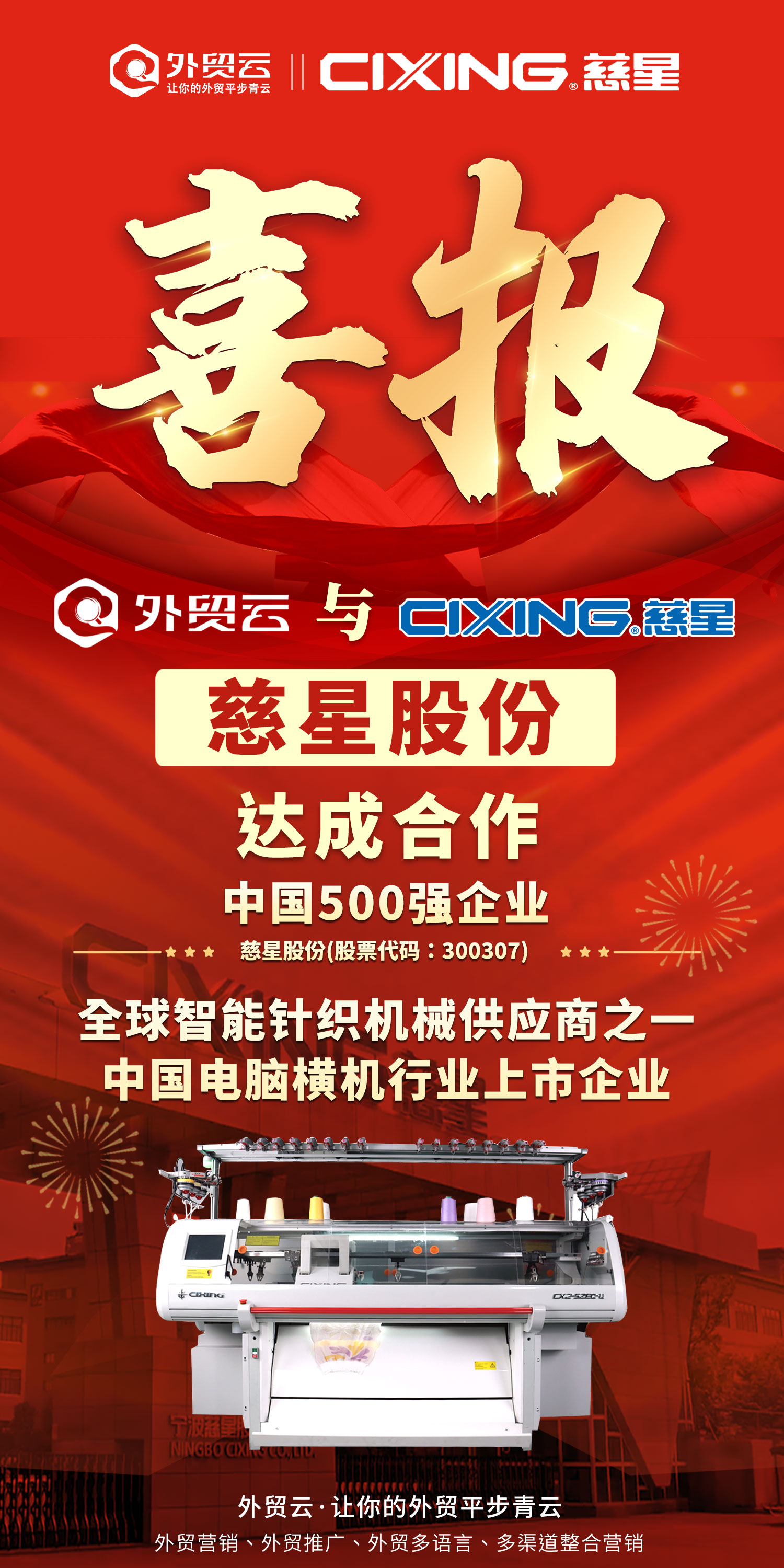 外贸云与宁波慈星达成合作,宁波慈星股份有限公司始创于2003年,是中国电脑横机行业唯一上市企业,全球智能针织机械供应商之一、中国500强企业...该企业主要从事电脑针织机械的研发、生产和销售的高新科技企业,产品年产量和年销量均居世界首位,实力雄厚!
