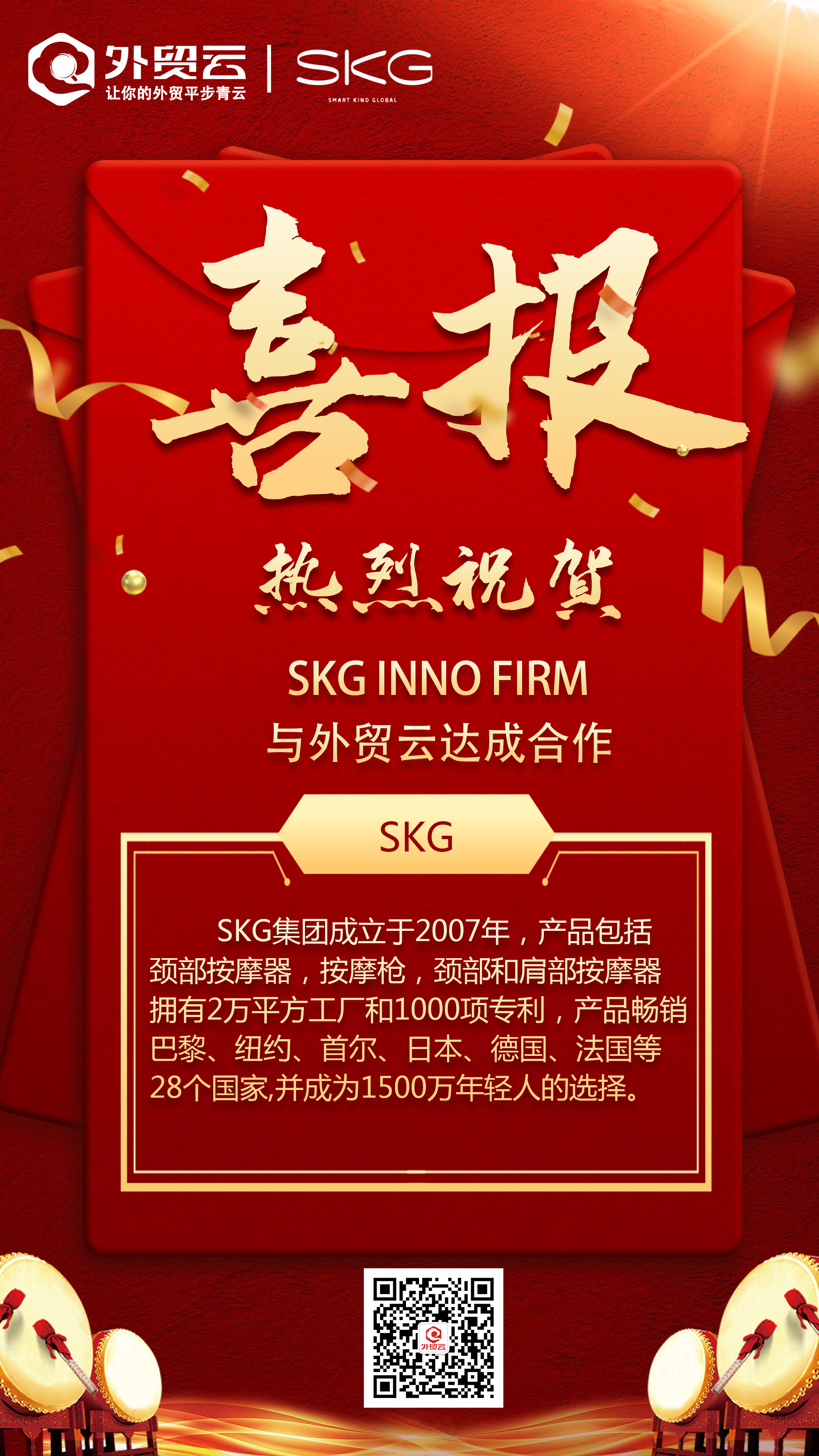 SKG集团成立于2007年,产品包括颈部按摩器,按摩枪,颈部和肩部按摩器,拥有2万平方工厂和1000项专利,产品畅销巴黎、纽约、首尔、日本、德国、法国等28个国家,并成为1500万年轻人的选择。