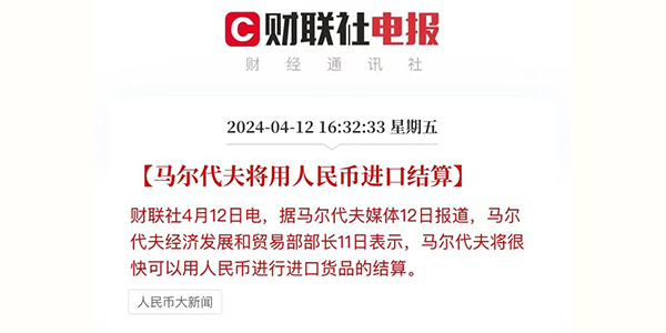 马尔代夫采用人民币结算,人民币国际化步伐加速。