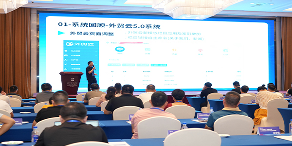 接下来是外贸云技术总监杨总的主题演讲《焕新迭代,创新无界》。在会议中,杨总详细回顾外贸云、视贸通和爱社媒的营销系统升级历程,通过不断的升级打磨,实现产品系统升级,同时对即将上线的新产品——AI智联客服系统和外贸先蜂ERP系统做了详细的功能介绍。